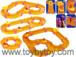 Из ярких пластиковых деталей собирается игровая водная система - Акватрек. Акватрек предназначен для запускания корабликов и т.п., игр можно придумать множество. Из деталей можно собрать разные варианты треков разной формы и сложности (наборы бывают разные - от очень простых до больших и сложных). Желоба соединяются резиновыми крепежными деталями с прокладками, которые исключают протекание. Играть можно не только в ванной, но в любом удобном месте, можно в комнате на полу поставить и купить пупсов. В наборе могут быть кораблики с фигурками.