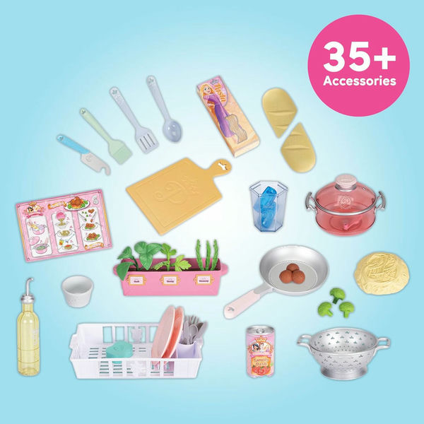 Итак, эта игровая кухня для детей оснащена пятью интерактивными приборами со световыми и звуковыми эффектами, функцией приготовления на пару, более чем 35 аксессуарами и набором для приготовления великолепного блюда Ночь макарон