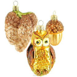 Украшения, изготовленные из высококачественного стекла в виде фигурок совы, ореха и шишки, являются ручной работой украинских мастеров-стеклодувов.