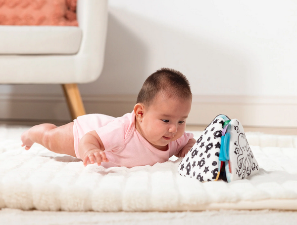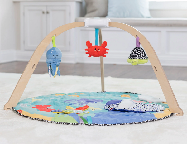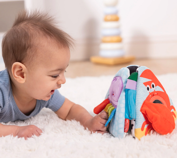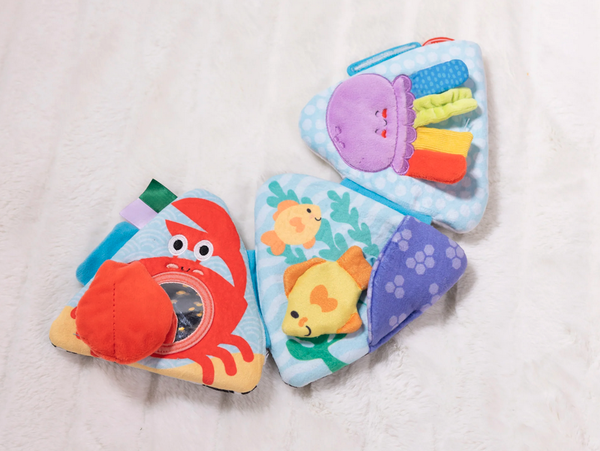 Три складывающиеся панели с очаровательной графикой на тему океана и дружелюбными персонажами лежат ровно или складываются и образуют вертикальную пирамиду. Имеет высококонтрастную черно-белую графику на одной стороне, что отлично подходит для визуальной стимуляции. На другой стороне изображены красочные морские обитатели: краб с зеркальцем и пищалкой, сенсорные ленточки на медузе, рыбка, которую можно хранить в кармане. Отличный подарок для новорожденных и самых маленьких.