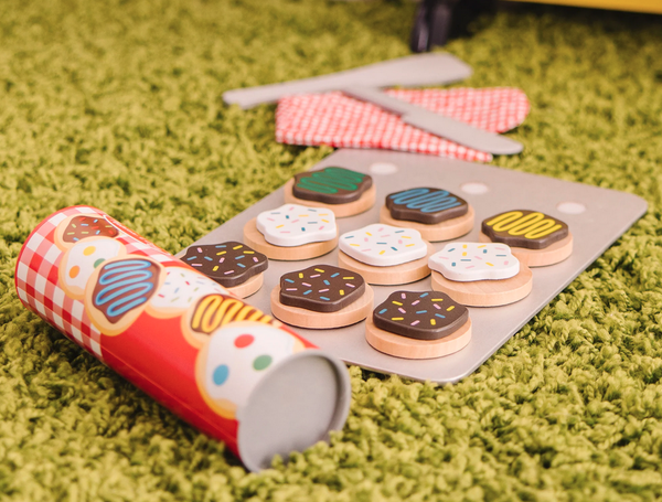 Этот красочный набор для приготовления печенья включает в себя 12 деревянных формочек для нарезки печенья и 12 начинок для печенья, деревянный нож, лопатку, противень и прихватку для безопасной игры.