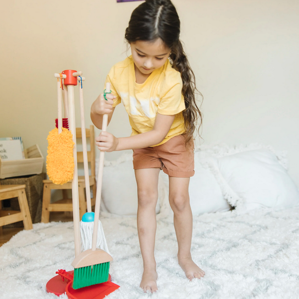 Этот игровой набор из шести предметов дает детям все необходимые инструменты для поддержания чистоты в доме. Метла, швабра, тряпка для пыли, совок для мусора и щетка удобны в использовании и просты в хранении - просто повесьте их на прочных шнурах на прилагаемую подставку для аккуратного и компактного хранения. Ручки из натурального дерева придают изделиям долговечность и классический внешний вид, а яркие расцветки создают атмосферу веселья. Набор развивает силу хвата, крупную и мелкую моторику, творческие способности и умение рассказывать истории, а также помогает внукам научиться прибираться в доме.