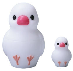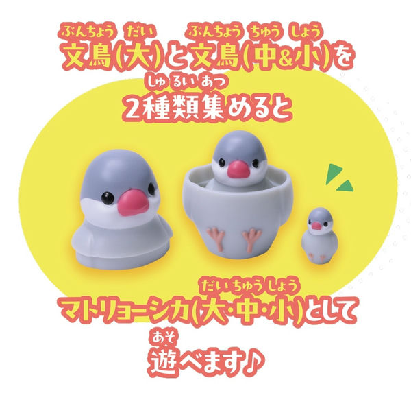 Серия представляет собой капсульную игрушку с мотивом яванского воробья. Если вы соберете два вида наборов, "большая птичка с яйцом" и "средняя с маленькой птичкой", вы сможете играть с ними как с большими, средними и маленькими игрушками-матрешками.