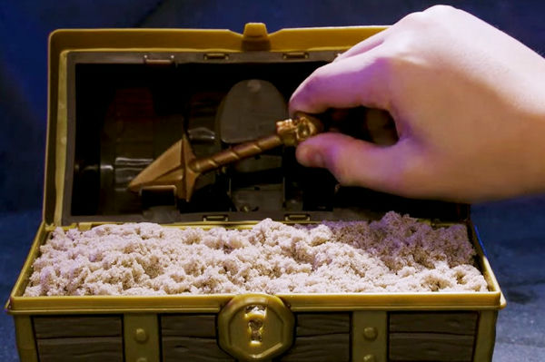 Кинетический песок всегда немного влажный и никогда не высыхает, поэтому охотники за сокровищами могут много раз копаться в сундуке и играть с тестообразным песком без особого беспорядка вокруг. В песке спрятаны серебряный кортик, золотой резной осьминог и секретный ролик. Обнаружив эти предметы, вдавите ролик в кинетический песок, чтобы открыть инструкции по поиску еще более секретных сокровищ.