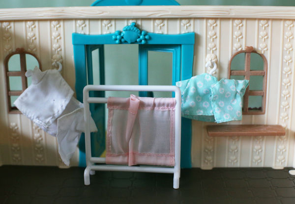 Прилагаются костюмы как для врача, так и для пациента, а также ширма (тканевая). Для костюмов есть вешалки. Вот только для врача взрослый костюм - с очень широкой горловиной (Вудзики - упитанные создания), поэтому на вешалке обычным способом не держится, повесили через рукав:
