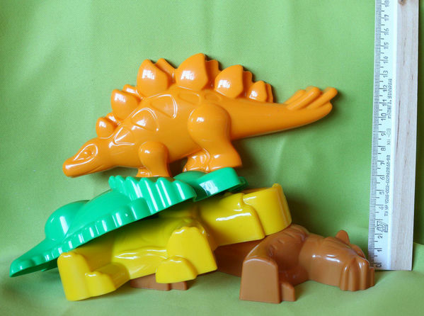Все 4 формочки - разных цветов, крупные, очень удобные. Замечательные игрушки - для песочницы, для дачи, очень пригодятся весной и летом.