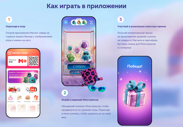 Играйте с Монстриксами в мобильном приложении Магнит, получайте моментальные призы и шанс участвовать в розыгрыше ценных призов.