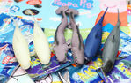 Слева направо: две длиннокрылых акулы, белая и Замбези, две плащеносных акулы.Белая акула - это очень радостное событие: эта игрушка необычная. Она единственная из 16-ти штук в серии, которая меняет цвет в горячей воде. Обычно она синяя, в горячей воде становится серой.