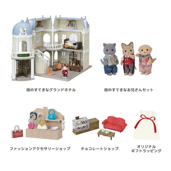 Этот подарочный набор наполнен очарованием серии Town, в него входят "Красивый городской гранд-отель", "Красивый городской набор старших братьев", "Магазин модных аксессуаров" и "Шоколадная лавка".