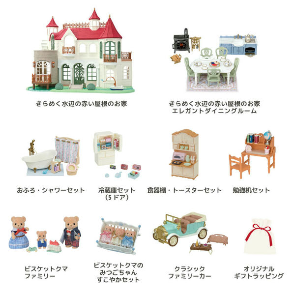 Дом со сверкающей красной крышей на берегу моря, похожий на замок, с садом, по которому течет ручей. Идеальный набор мебели для этого дома "Элегантная столовая на берегу моря с красной крышей". Это совершенно роскошный подарочный набор, он также включает всех членов "Семьи бисквитных мишек" и "Классический семейный автомобиль".