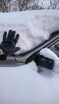 Ну и ещё немного снега. Это машина, ее стекло и зеркало и моя рука для понимания уровня снега на стекле. Прямо две мои ладошки в высоту. И она засыпана снегом до самого стекла вокруг