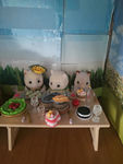 Тут столовые приборы мне не знакомы)) миниатюру сладости я узнаю, набор день рождения у моря тоже. Столик прекрасного размера. На оригинальных столах всегда маловато места для всех блюд, приборов и посуды