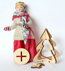 Набор рядом с 18-см куклой. Две детали для ёлочки, круглая подставка для неё, лошадка.